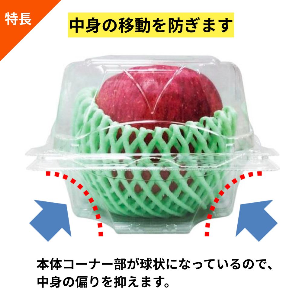 - 中身がズレない専用設計 容器のコーナー部が球状になっているため、輸送中に中身が動いて傷つくのを防ぎ、偏りを抑えます。