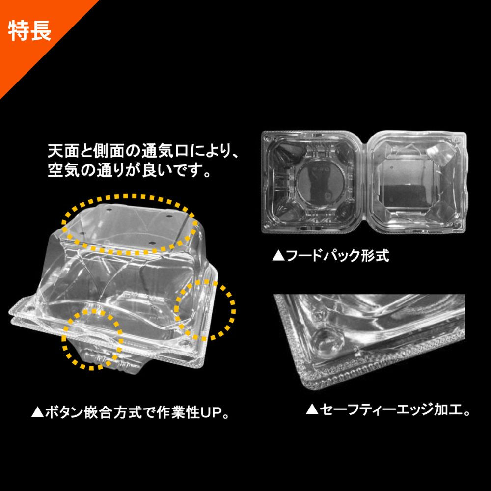 - 優れた通気性で鮮度をキープ 天面と側面に効果的に配置された通気口が、容器内の空気の通りを良くし、青果物の鮮度を保ちます。