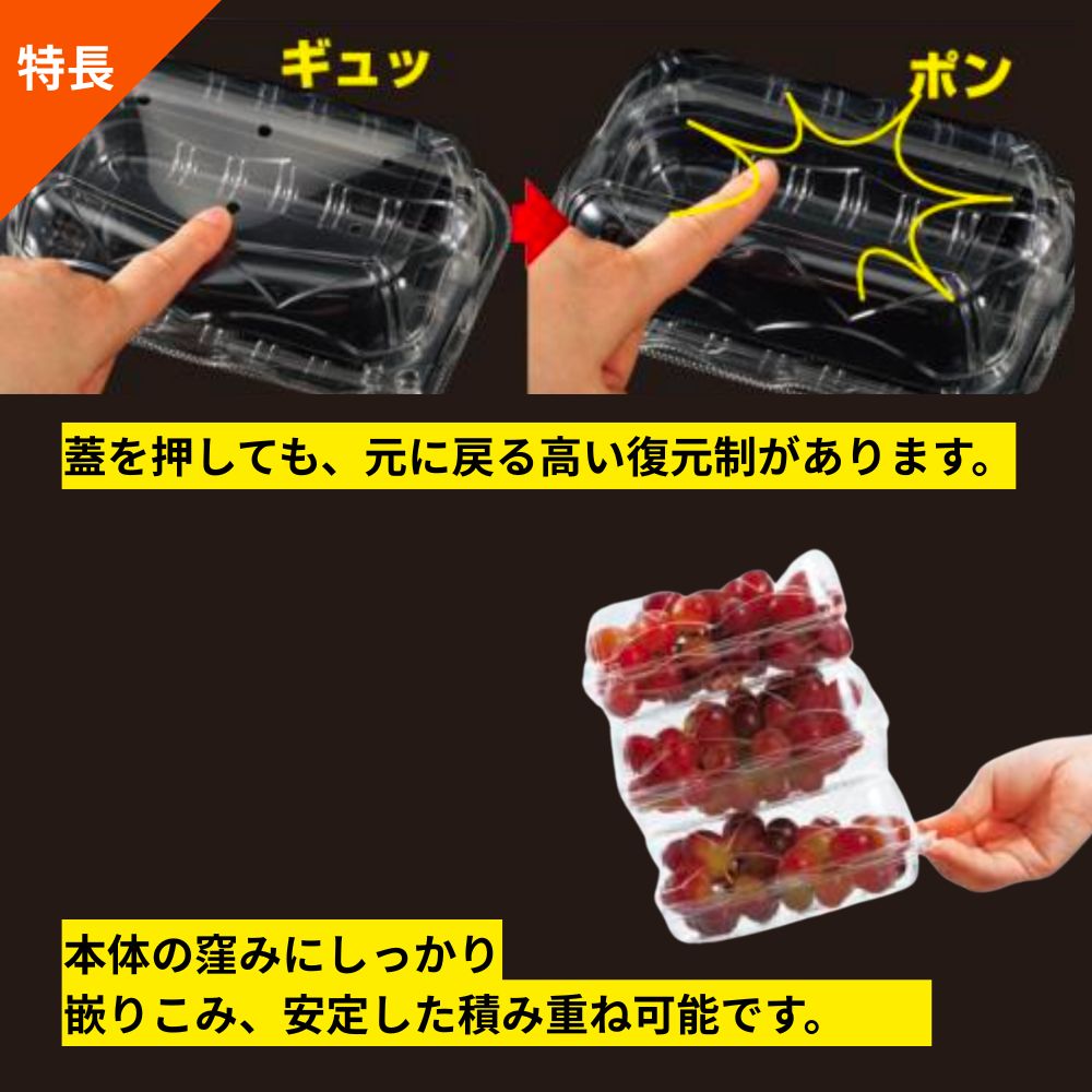 - 安定した積み重ね性能 容器の蓋と本体底がしっかり嵌まり込むよう設計されており、輸送時や店頭での陳列時に安定した積み重ねが可能です。