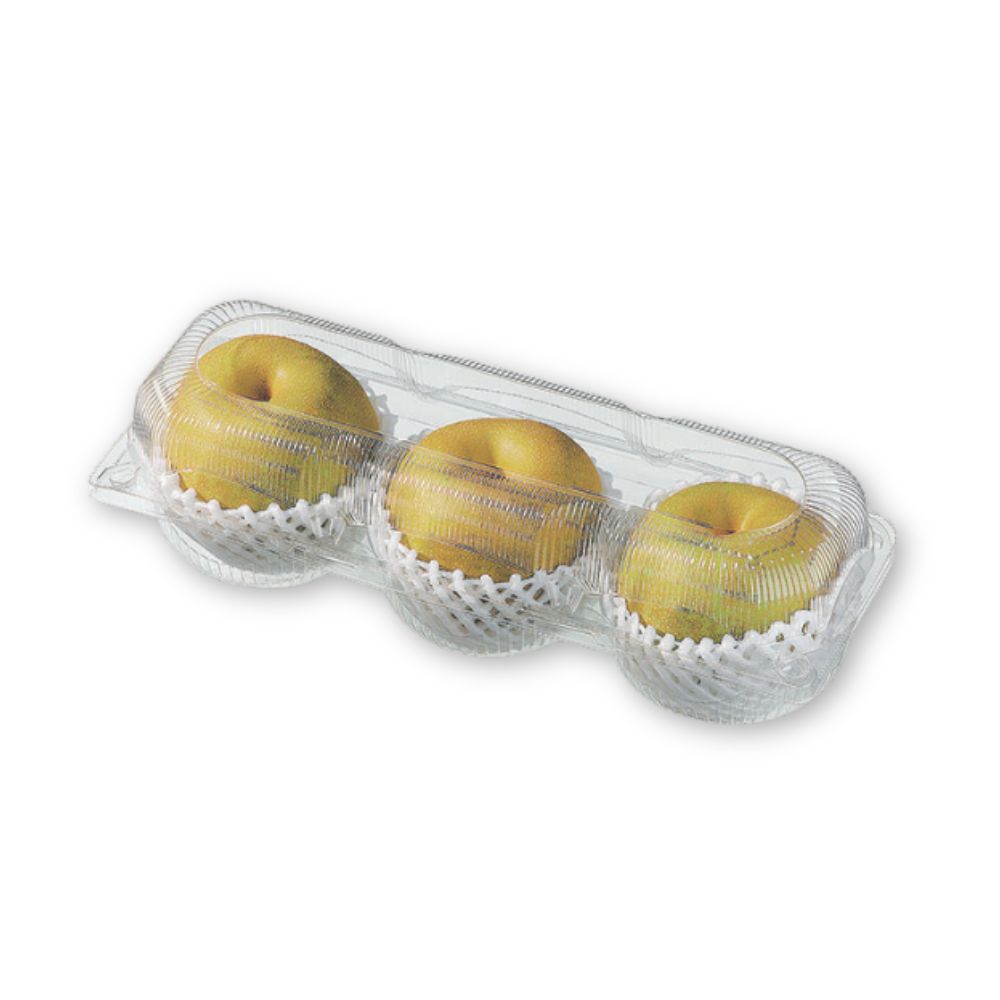 | 商品説明 | 桃やりんごなどの丸い青果物に最適な透明容器です 。 ペットボトルをリサイクルした環境に優しい「エコAPET」を素材として使用しています 。果物をしっかり固定する底の形状 、重量があっても外れにくいボタン式の嵌合(かんごう)、そして軽量でありながら強度を高める側面の細かいリブ構造 が、輸送時の大切な中身を傷みから守ります。 また、売り場で安定して積み重ねられる形状 や、鮮度を保つための通気孔 も備わっており、機能性に優れています。 |
