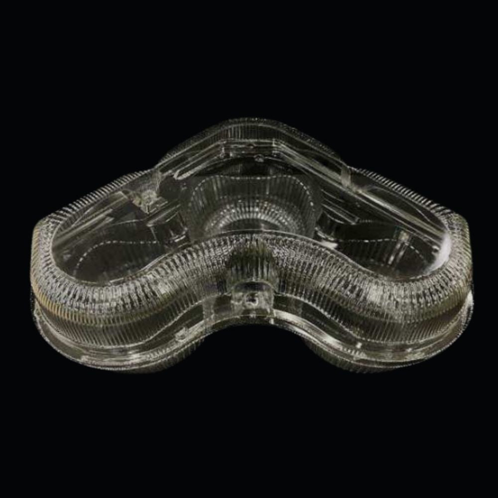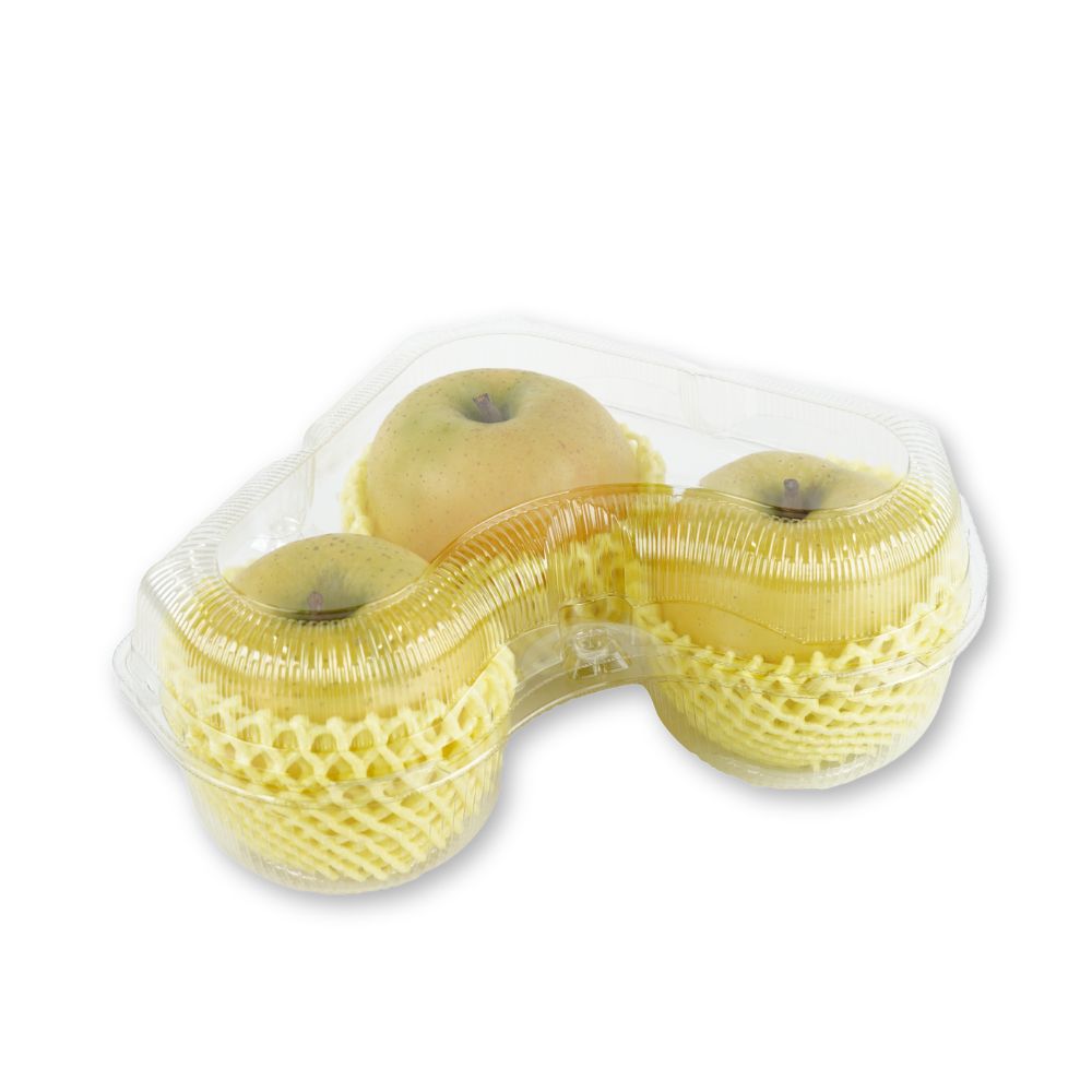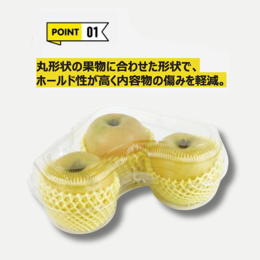 大玉果実3個をしっかりホールドするペコペットフルーツL型4L-3。丸い果物にぴったりフィットする形状で、輸送中の傷みを軽減します。さらに、青果輸送コンテナのハーフサイズ(400×300mm)にL型の組み合わせで効率よく収まり、輸送効率も抜群です。果実の品質を守りながら、運搬コストの削減にも貢献します。