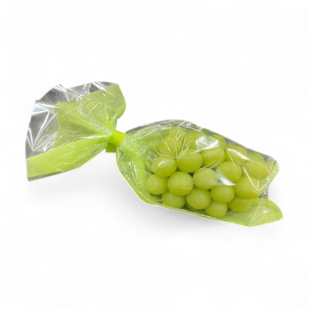 大粒のぶどう一房がゆったり収まるサイズ設計で、表面は透明フィルム、裏面はグリーン色の不織布を使用。
