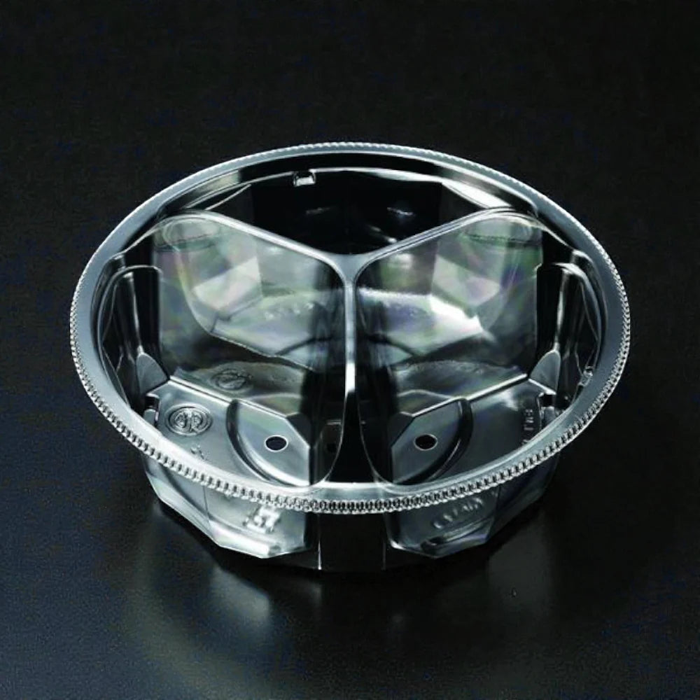 | 商品説明 | 3ポケットで品種別に分けて詰められる150φ丸型容器。脱粒ぶどうの有効活用やギフト詰め合わせにも好評です。※蓋は別売りです。 |