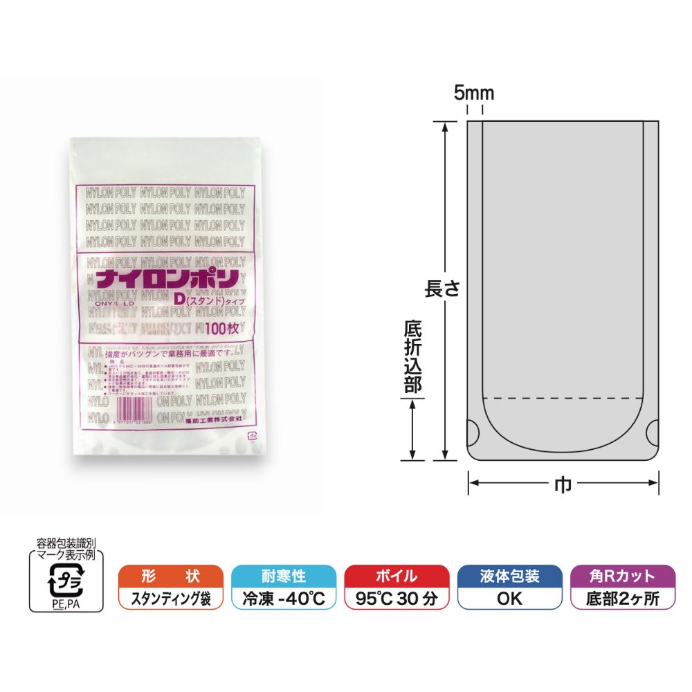 ナイロンポリ Dタイプ規格袋は、-40℃の冷凍から90℃で30分間の高温ボイル殺菌まで対応可能な高性能包装袋です。