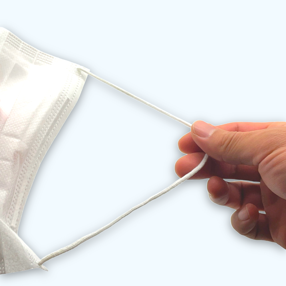 ③上部ゴムを後頭部にかけ、ノーズピース部を押さえた状態でマスクのプリーツを下に向かって開き、アゴの下までしっかりカバーしてください。