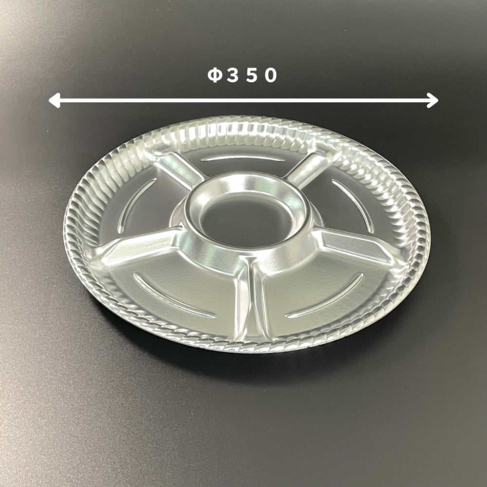 銀色、丸型で仕切りが3つの汎用性が高い定番オードブル容器