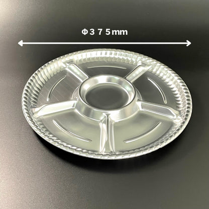 銀色、丸型で複数の仕切りがついた汎用性が高い定番オードブル容器