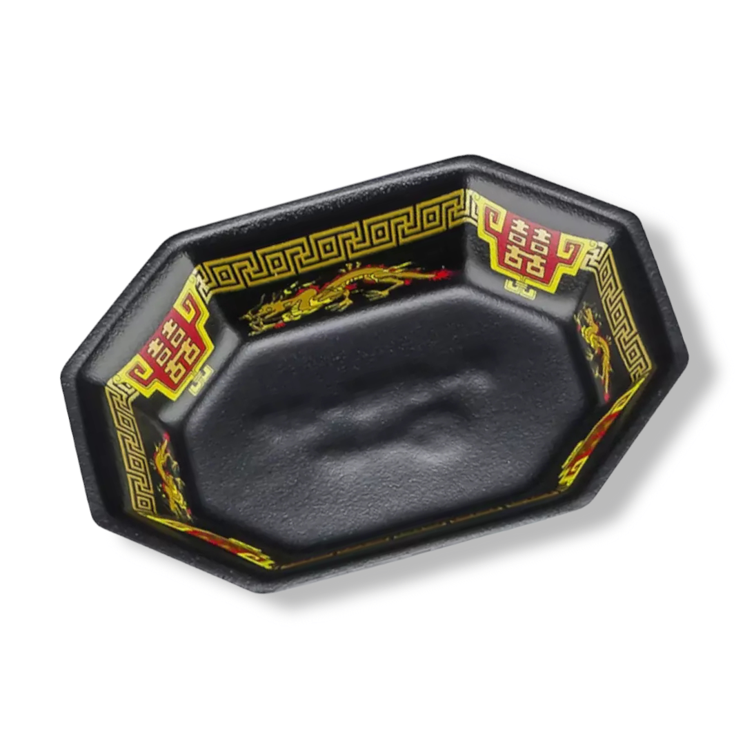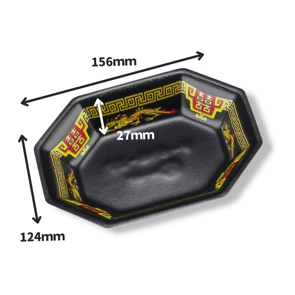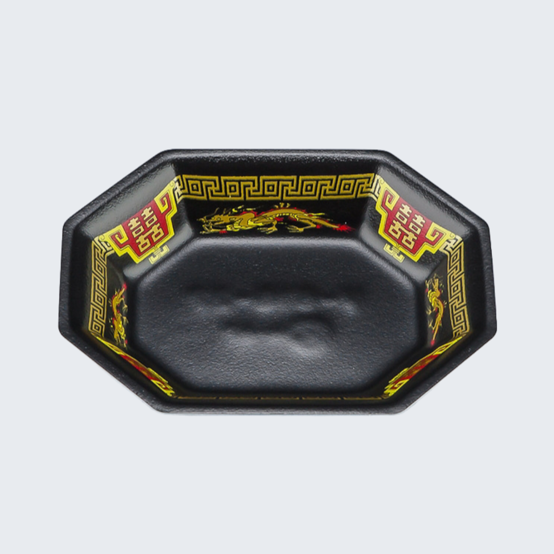 黒をベースにした飛龍柄の惣菜容器です。エビチリや青椒肉絲などの中華料理におすすめです。大学いもの容器としてもよく採用されています。