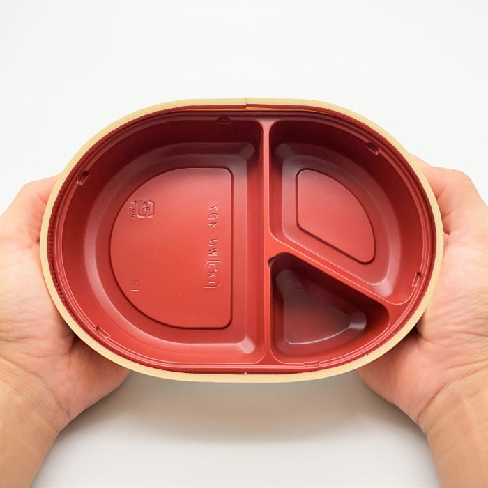 電子レンジ対応の折箱容器, 内装品を耐熱素材にする事により電子レンジ加熱ができる製品に実現しました。